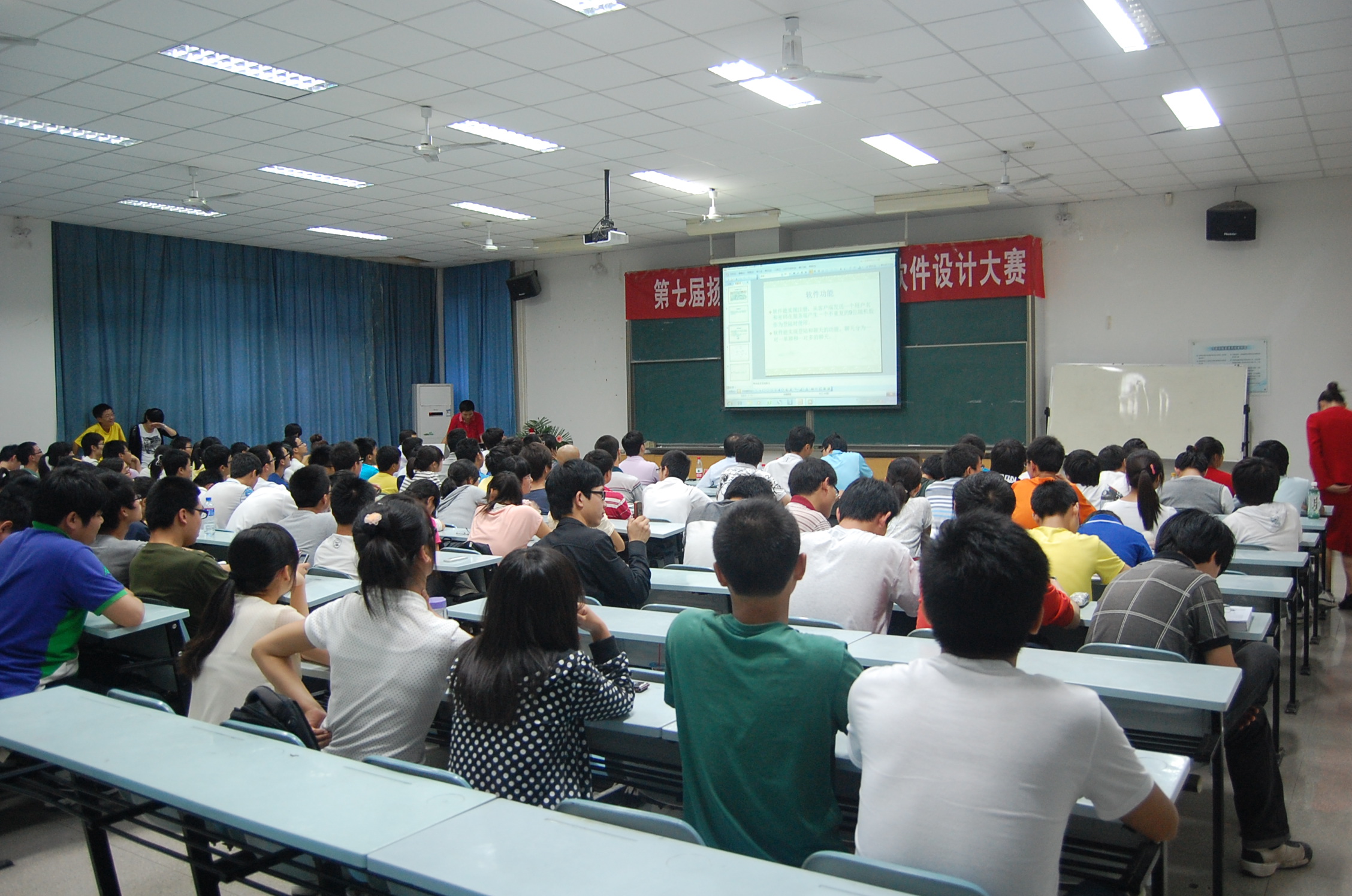 随后进行的作品展示环节是此次比赛的核心部分。入围决赛的作品范围跨度较大,技术水平较高。有既娱乐又动脑的拼图游戏软件、有服务农业的农田杂草图像识别软件、有贴近生活的安卓平台安全卫士软件、有支持旧书营销的管理软件等等。参赛选手联系生活实际,发挥特长,用各种语言编写软件,小巧精致,实用性强,有的甚至已经运用到自己的手机上。大赛中选手们详细介绍了各自的作品,其中软件界面、配乐的匠心独运无不令在座的同学啧啧称奇。参赛队伍的团队合作精神也在作品中充分展现,分工不同的团队成员负责回答评委提问中的某一方面。评委老师针对制作技术、前台平面设计、后台操作等方面给予了精彩点评,赢得了现场同学们的阵阵掌声。大赛共评出一等奖一名,二等奖三名,三等奖四名和优秀奖两名,来自信息学院的尹强同学以其作品《3D俄罗斯方块游戏》获得一等奖,其才华和能力获得了评委的一致称赞。