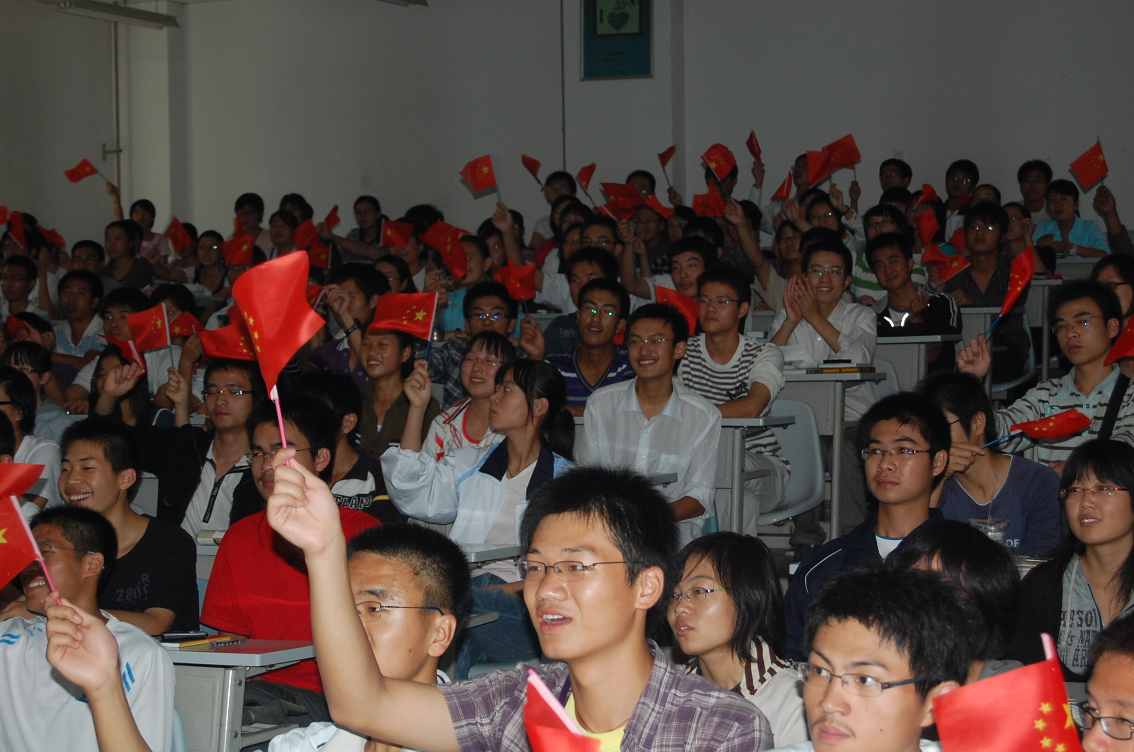 当太阳绽放出绚丽的光彩,信息学院学子欢聚在8T09教室,看着祖国取得的一个个进步,大家震撼了。当看到参演军人们每人每天流下两千克汗水,一个个满身是汗,同学们不禁向他们肃然致敬;当看到一个个整齐的方队展现的满天豪情时,让在场的每个人都情不自禁地鼓掌;当看到我国自行设计制造的新式武器驶过天安门时,大家都激动而又自豪地呐喊,不停地挥舞手中的五星红旗,表达了作为中华民族一员的民族自豪感。