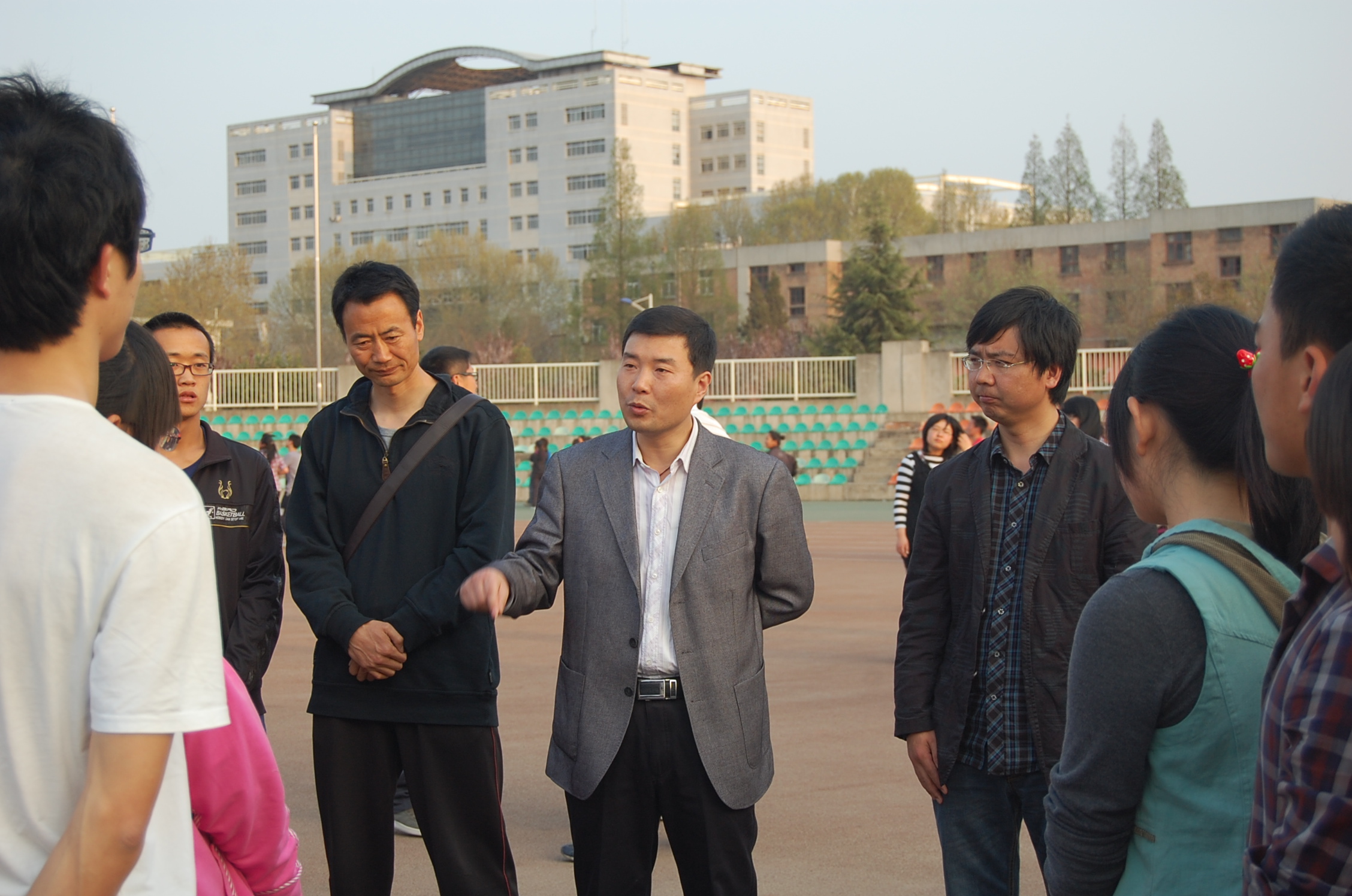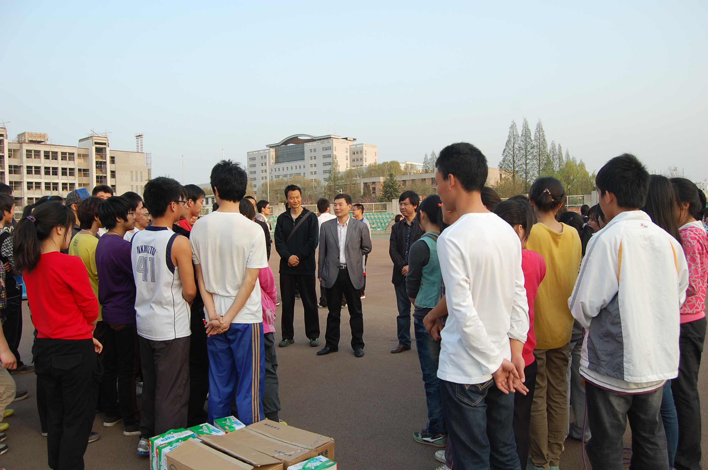 4月9日下午6:00,我院党委副书记何卫军携带营养品赴田径场慰问了积极备战校运会的运动员们。学院辅导员谷申杰老师和倪玲老师陪同参加了此次活动。
