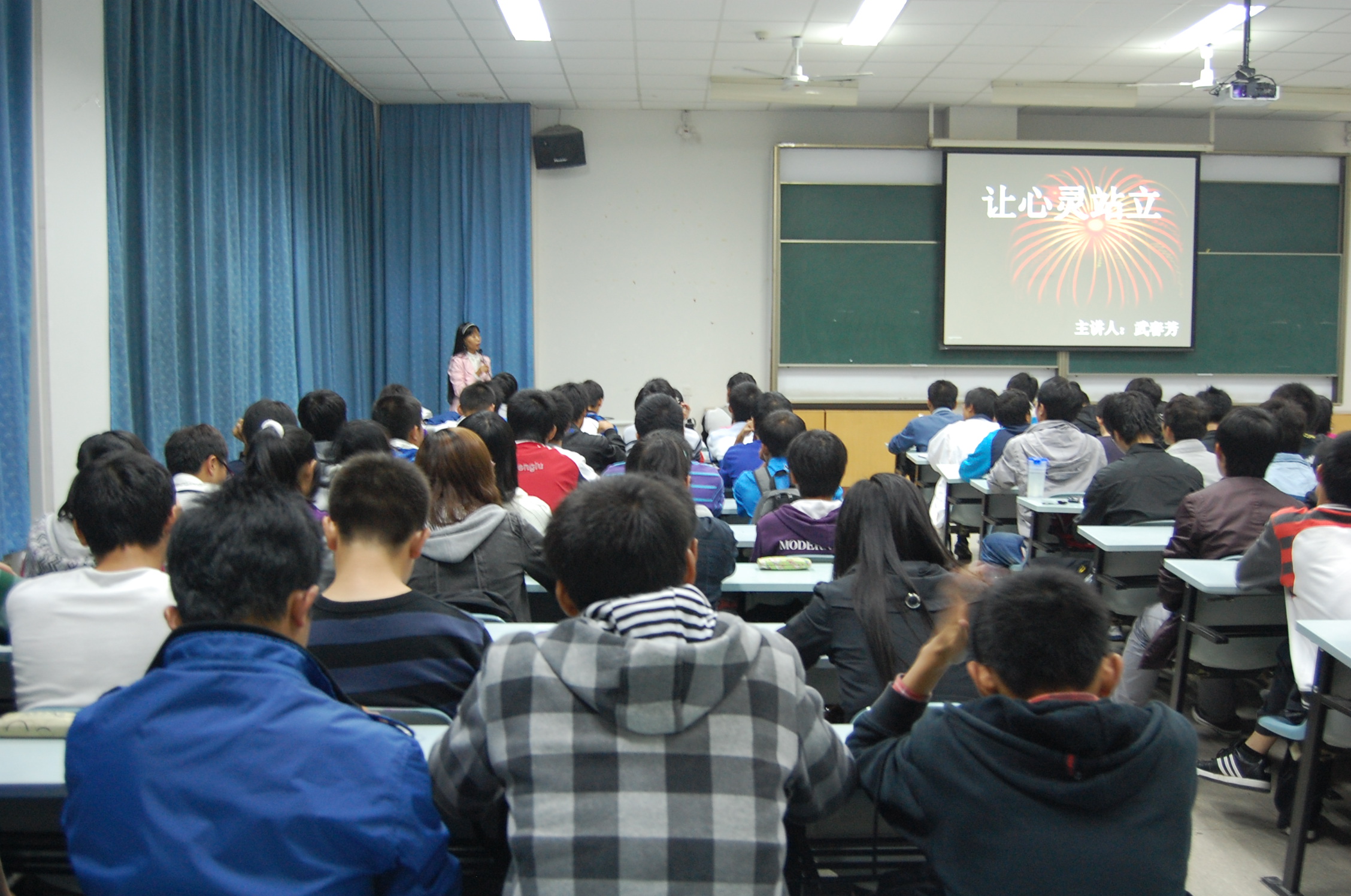 武春芳老师以一个残疾人的真实的案例,向同学们阐述了大学生活中各种各样的生活困扰,对新环境新起点的迷茫,对学习压力的不适应,对恋爱悲剧的无法承受,对自我价值的疑惑,对人际交往的苦恼等等。老师以幽默朴实的语言,带动所有同学的乐趣,然后从心理学的角度给同学们进行有效的心理引导,提供解决心理困扰的方法。她指出,进入大学,一切从零开始,只有变被动为主动,尽快找到心理平衡,才能更好的适应新的学习方法,顺利度过四年大学生活,促进学业成绩的提高。她建议同学们永远把泪水留给自己,把微笑和坚强留给别人,只有这样,才能真正的让心灵站立。