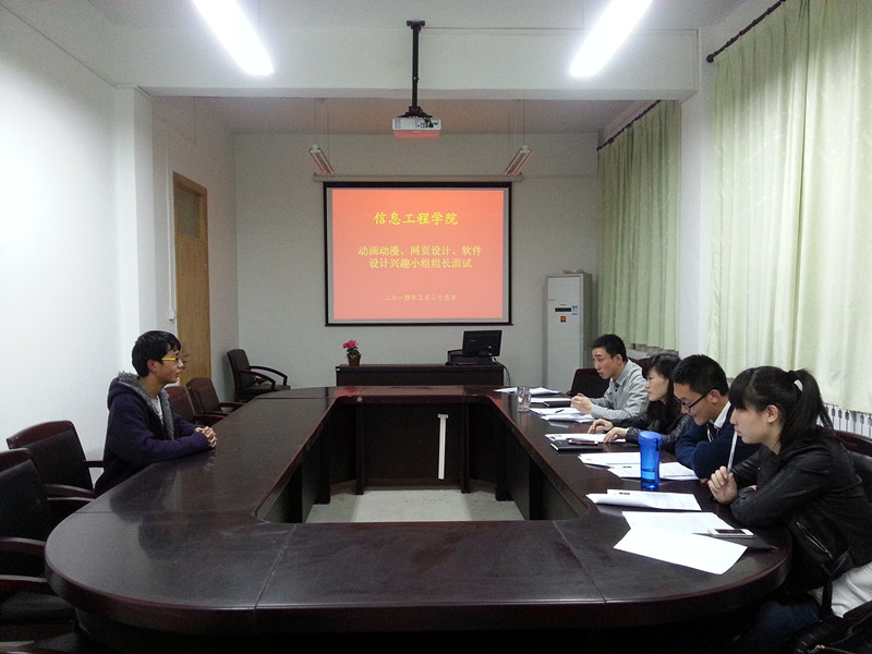 2014年3月25日晚,在bat365中文官网网页版行政楼301进行了动漫设计、网页设计、软件设计三个兴趣小组组长竞选面试。学院学工秘书王淑珍、学院团工委书记仵亚伟、学院13级辅导员党艳东、学院团工委学生会主席秦亚恒、副主席宝音以及信息技术部部长张向阳对曾德军等10名竞选者进行了面试。